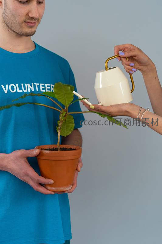 一位身穿志愿者T恤的男子手捧盆栽,另一人正用洒水壶为其浇水,画面温馨,传递环保与协作精神。