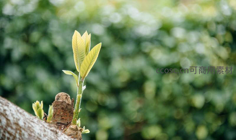 从枯木树桩中顽强钻出的嫩绿新叶,在模糊绿意背景衬托下,彰显生命不息、自然复苏的强大力量。