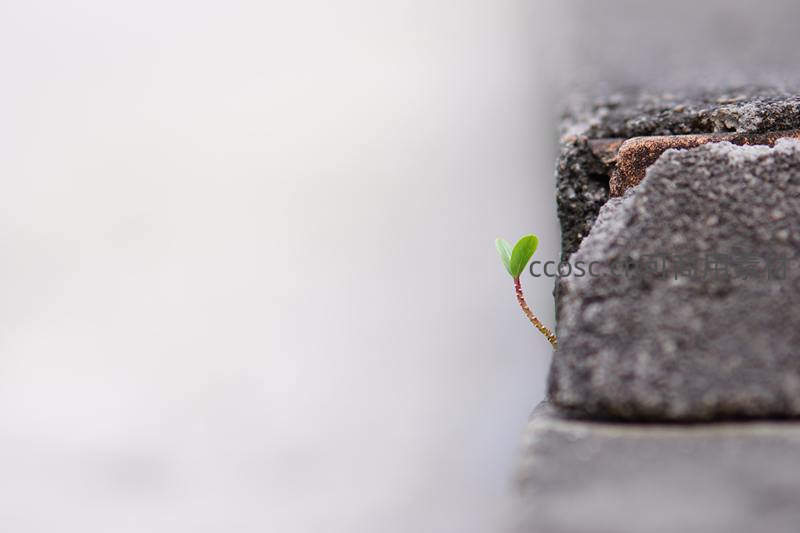 一株纤细的绿色幼苗从粗糙的灰色砖块缝隙中探出头来,背景虚化成纯净的浅色,突显了生命在逆境中迸发的力量与希望。