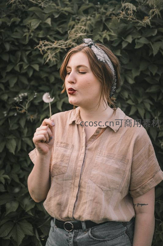 一位年轻女子闭眼轻吹蒲公英,神情专注而温柔,背景是茂密绿叶,营造出宁静美好的氛围。