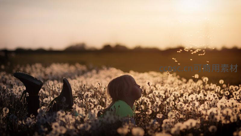 孩童惬意躺卧在广阔蒲公英花海中,夕阳余晖洒落,种子随风飘舞,尽显无忧无虑的童年时光。