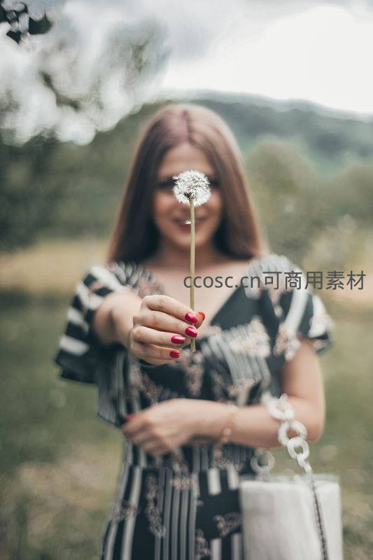 一位穿着条纹连衣裙的女子将蒲公英举至眼前,含笑望向镜头,背景是模糊山林,意境悠然自得。