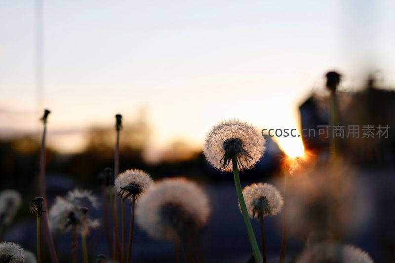 在温暖的夕阳光线下,一株蒲公英的绒球清晰可见,背景虚化,营造出宁静而梦幻的自然氛围。