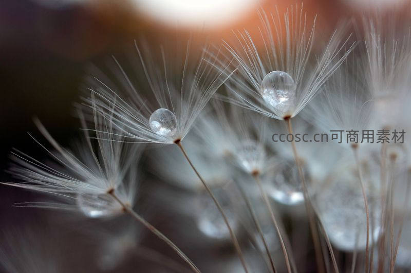 晶莹剔透的水珠挂在蒲公英种子上,在柔和光线下折射出光芒,展现微观世界的精致与生命力。
