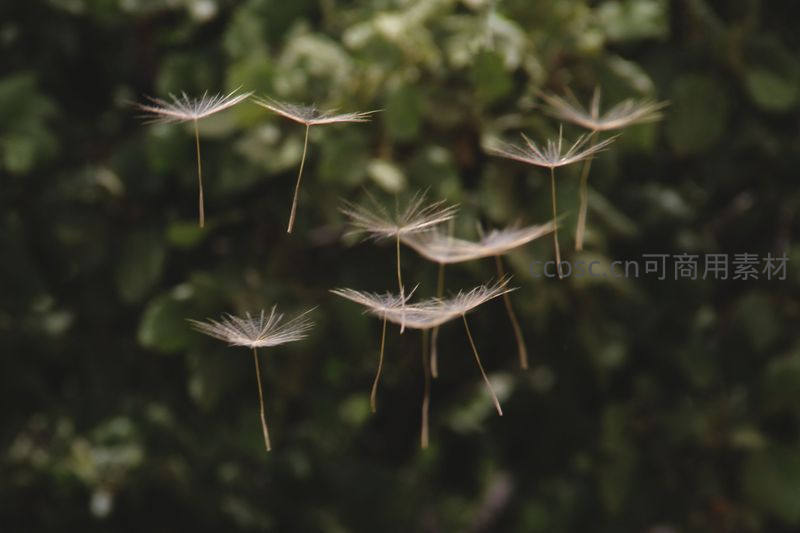几颗蒲公英种子在空中优雅飘浮,背景是模糊的绿叶,定格了生命传播的灵动瞬间,充满诗意与动感。