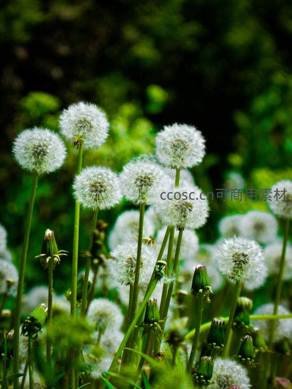 一片翠绿草地上,众多蒲公英种子球随风轻轻摆动,洁白绒球与鲜绿茎叶交织,洋溢着春天蓬勃的生命力。