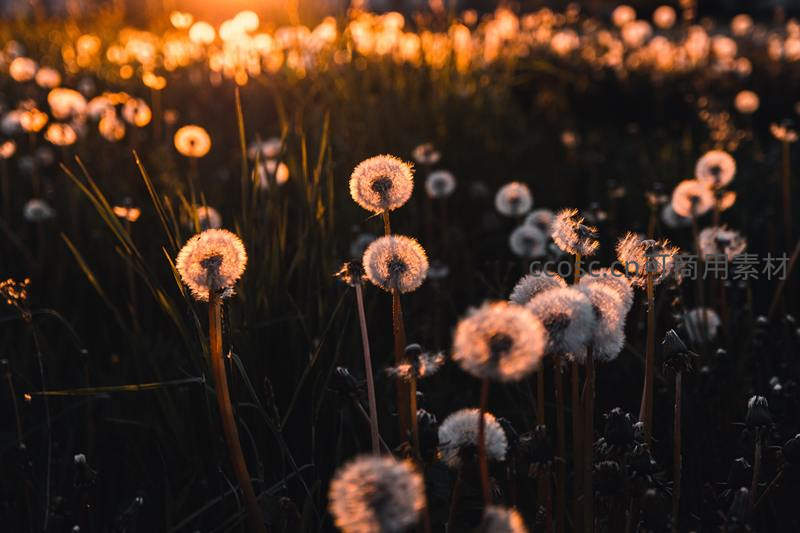 落日余晖为蒲公英镀上金边,整片草地沐浴在暖光中,营造出如梦似幻、温馨浪漫的自然黄昏美景。
