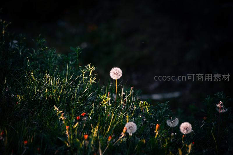 在黄昏的柔和光线下,几株蒲公英静静伫立于青翠草丛中,绒球般的种子头在逆光中显得格外梦幻而宁静。