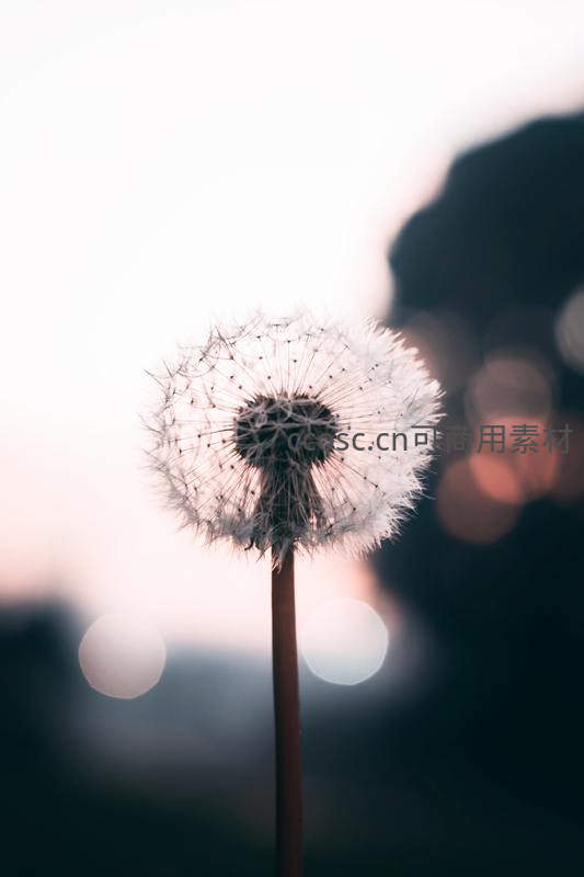 在黄昏柔和的光线下,一朵蒲公英绒球清晰可见,背景是梦幻般的散景光斑,营造出宁静而诗意的氛围。