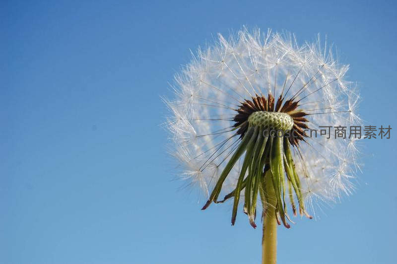 从低角度仰望,蒲公英绒球在纯净蔚蓝天空背景下显得格外立体,细节分明,充满自由与希望的气息。