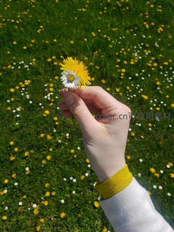一只纤手轻捏一朵雏菊与蒲公英,身后是铺满黄色与白色小花的广阔草地,展现春日田园的烂漫与惬意。