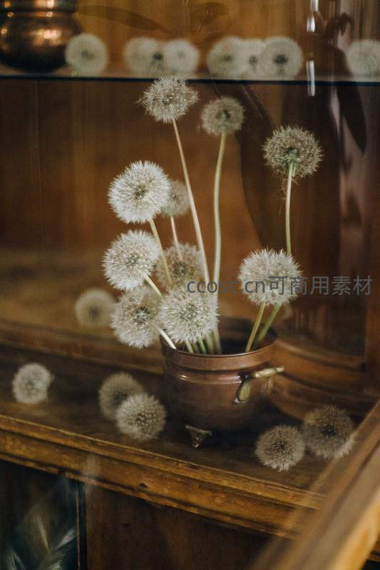 一束成熟的蒲公英插在古朴的铜罐中,置于木质柜台上,柔和光线与玻璃反光营造出宁静温馨的家居氛围。