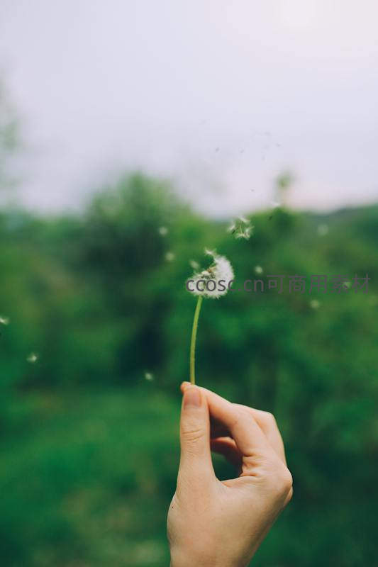 在一片翠绿的模糊背景前,一只手握着即将散开的蒲公英,几颗种子已随微风飘向远方,充满生机与动感。