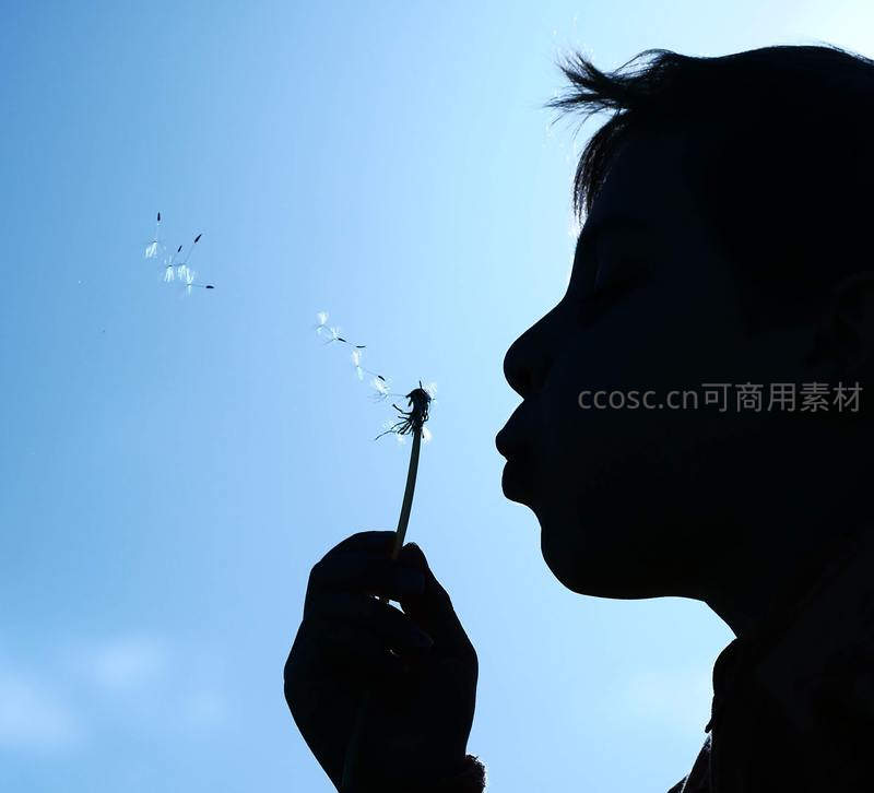 侧脸剪影的少年在晴朗蓝天下轻吹蒲公英,洁白的种子随风飘散,充满童真与诗意。