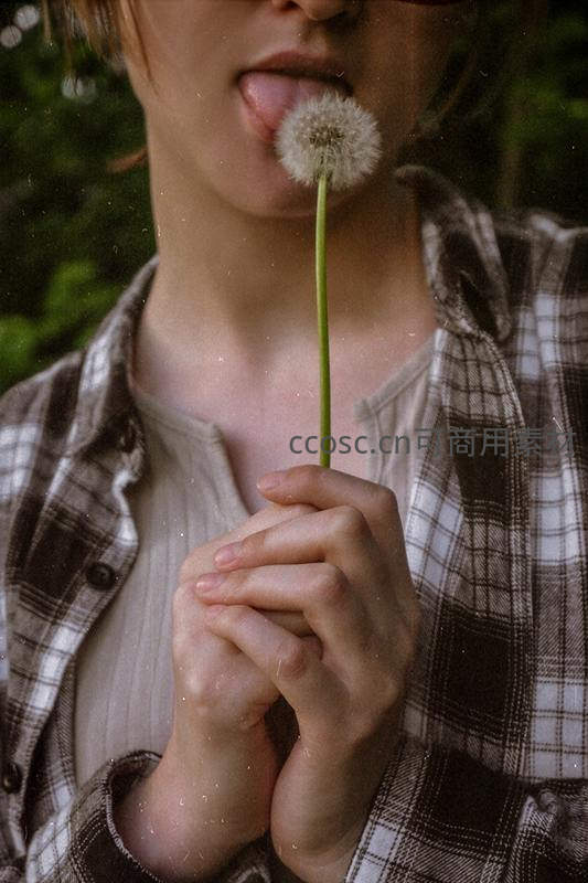 一位少女在户外伸出舌头轻触手中的蒲公英,画面充满童真与自然的和谐之美,背景绿意盎然。