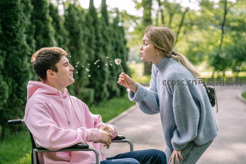 一对情侣在公园里甜蜜互动,女子正对着坐在轮椅上的男子吹蒲公英,种子纷飞,画面温馨浪漫,充满爱意与陪伴。
