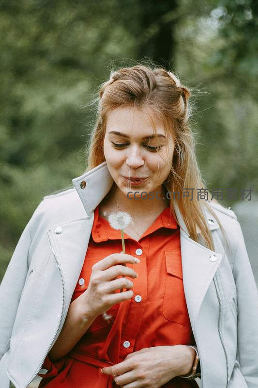 一位穿着红色衬衫和浅色外套的女子,在户外微笑着轻吹手中的蒲公英,画面温馨而美好。