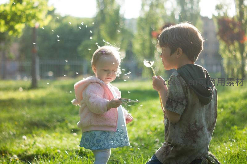 两个孩子在阳光明媚的草地上嬉戏,男孩吹散蒲公英种子,女孩好奇观看,画面温馨而充满童趣。