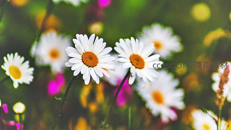 明媚阳光下,两朵盛开的雏菊亭亭玉立,洁白的花瓣环绕着温暖的橙黄色花心,背景是斑斓的彩色光斑,充满活力与希望。