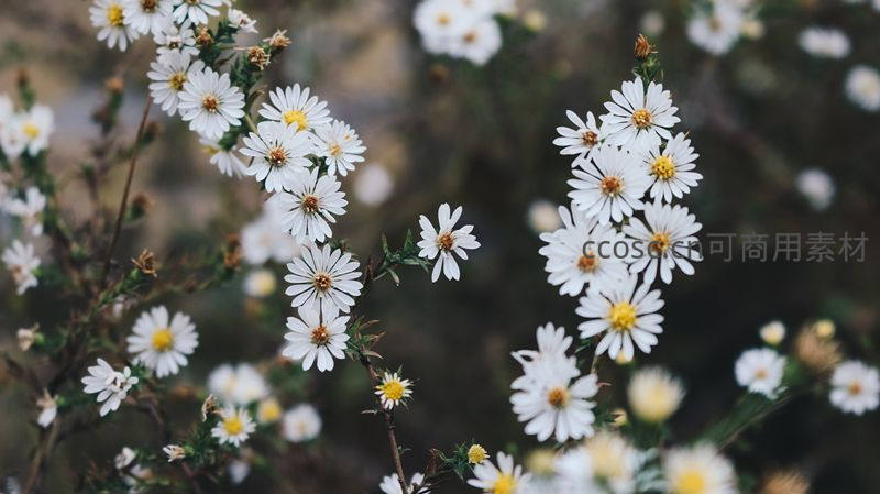 细长的枝条上缀满小巧洁白的雏菊,花朵密集而有序,背景朦胧,凸显其清雅脱俗的姿态,传递出春天的盎然生机。