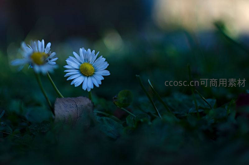 在幽暗的草地上,两朵雏菊在微光中悄然开放,深色背景衬托出花瓣的纯净,营造出一种静谧而略带忧郁的美感。