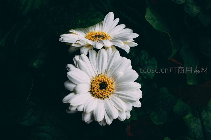 在深绿色叶片构成的暗调背景下,两朵洁白的雏菊清晰可见,花瓣与花蕊细节突出,光影对比强烈,富有艺术感。