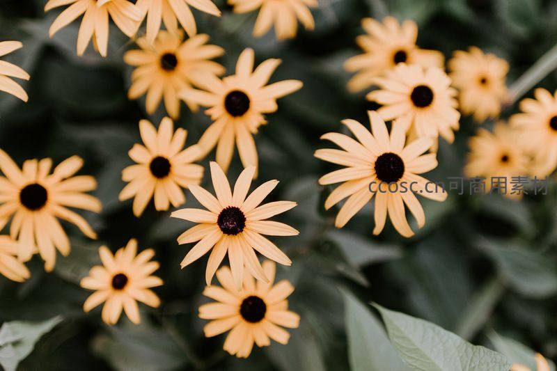多朵金光菊在绿叶衬托下盛放,花瓣呈明亮黄色,中心为深黑色,色彩对比强烈,充满夏日活力。