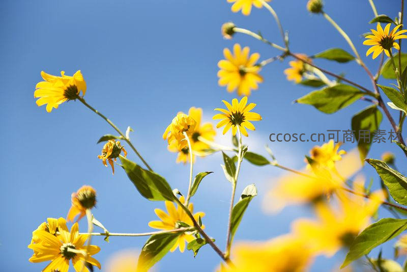 几株向日葵迎着晴空舒展枝叶,金黄花瓣在阳光下熠熠生辉,展现出蓬勃的生命力与自然的朝气。