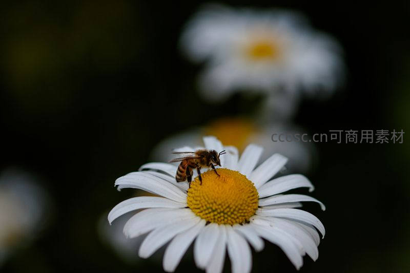 一只勤劳的蜜蜂正停在一朵盛开的白色雏菊上,专注地采集着金黄色花蕊中的花蜜,背景虚化突出主体。