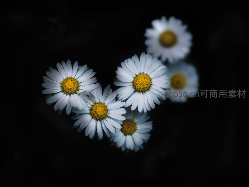 几朵洁白的雏菊在纯黑背景下静静绽放,明亮的花瓣与深邃的背景形成强烈对比,营造出宁静而神秘的艺术氛围。