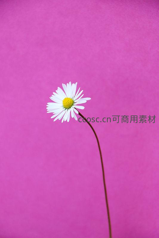 一支纤细的雏菊优雅地立于鲜艳的粉红色背景前,简洁的构图突显了花朵的纯净之美,充满现代设计感。