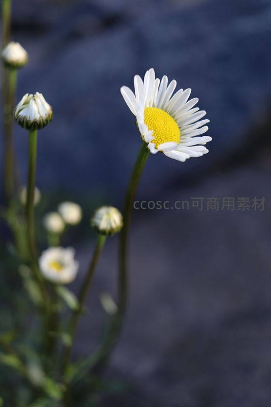 一朵独立的雏菊在深色岩石背景前昂首绽放,其洁白的花瓣与明黄的花心在微风中轻轻摇曳,尽显自然之美与生命力。