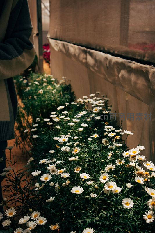 温暖的温室里,成片雏菊竞相开放,白色花瓣与嫩绿叶片交织,构成一幅生机盎然的园艺画卷。