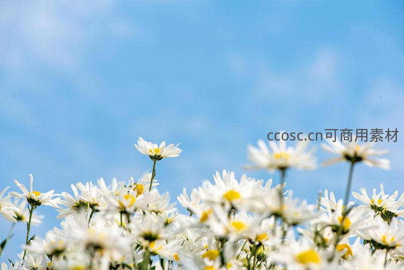 仰视视角下,大片雏菊向着蔚蓝天空伸展,洁白花朵与澄澈蓝天构成一幅开阔、明快的春日田园风光。